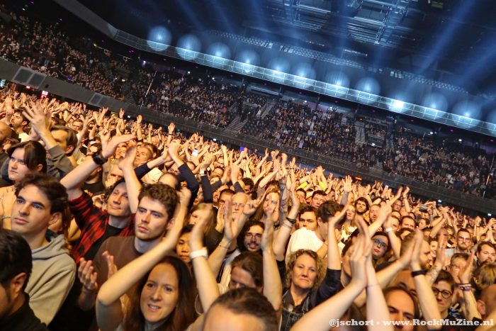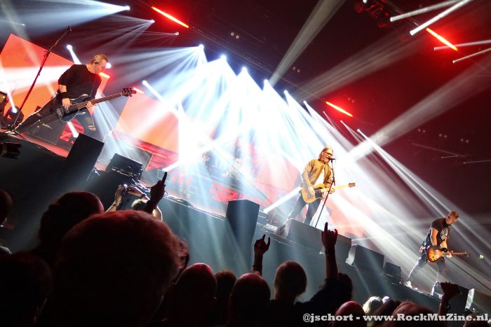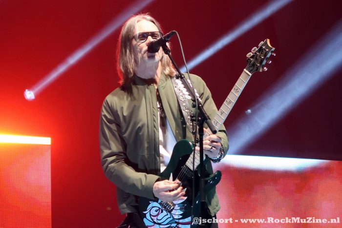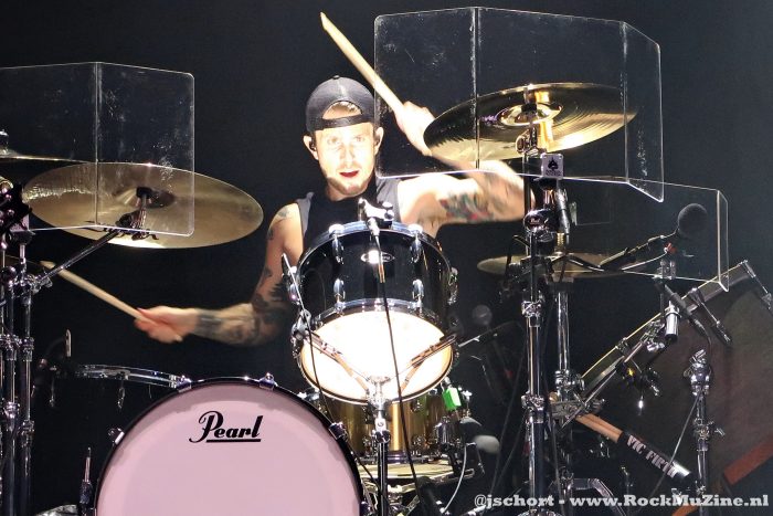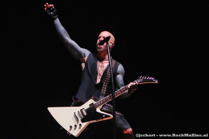 Dan Daughtry, dat aanzienlijk meer speeltijd krijgt. Het geluid is iets beter, maar nog steeds verre van ideaal. De poprock/post-grunge is enorm gelikt en eigenlijk te bombastisch; ik vraag me af hoeveel er meeloopt vanaf de mengtafel. Fitness-fanaat Chris Daughtry komt wat nukkig over, misschien omdat hij in zijn thuisland het publiek wat makkelijker meekrijgt? Opvallende tattoo-keuze ook: twee volledig zwarte armen – het oogt wat potsierlijk. Zingen kan de goede man zeker, maar als je beste nummer vanavond Journey’s ‘Separate Ways’ is, geeft dat toch te denken. Het countryachtige ‘Over You’ en het catchy ‘Heavy Is the Crown’ zijn overigens ook prima te verteren. De typisch Amerikaanse presentatie entertaint; er is genoeg interactie op het podium en de rookkolommen doen de rest. Een deel van het publiek zingt zowaar een groot deel mee, dus als opwarmer is Daughtry wel geslaagd, al zie ik hem op korte termijn geen eigen tour in Nederland vullen.