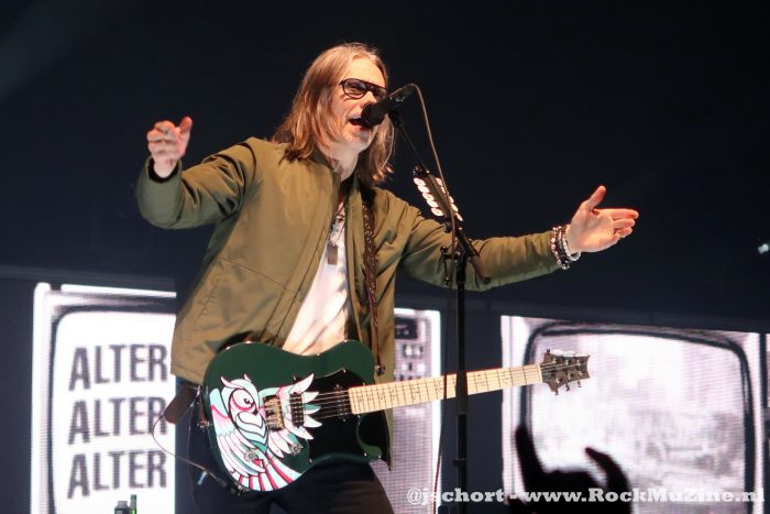 Na een half uur pauze lopen dan eindelijk de vier heren van Alter Bridge het podium op. De lichtshow en het podium zien er gestileerd en overtuigend uit, al zijn de vier schermen vooraan niet heel goed zichtbaar. Het geluid is hard, met helaas wederom erg zware bassen; hopelijk is dat verder de zaal in beter. Van het nieuwe te promoten album worden drie songs gespeeld: opener ‘Silent Divide’, het vrij doorsnee AB-nummer ‘What Lies Within’ en de door Tremonti gezongen melodieuze rocker ‘Tested and Able’. Helaas niet het lange epos ‘Slave to Master’. Verder krijgen we veel usual suspects, zoals de meedeinende ballad ‘Broken Wings’, de eerste hit ‘Open Your Eyes’ en de uptempo beukers ‘Cry of Achilles’ en ‘Addicted to Pain’. En zowaar is het mooi opgebouwde en lange ‘Fortress’ weer van stal gehaald.