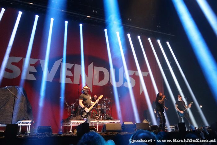 Iets voor 19.00 uur opent Sevendust het bal. In ons land is de band een stuk minder bekend dan in de VS, maar de krachtige mix van alternative- en nu-metal, vol zware, groovy gitaarriffs en de soulvolle zang van Lajon Witherspoon, is prima te verteren. Hoewel het geluid vooraan veel te zwaar is en de lichtshow nogal karig oogt, vindt de kritische luisteraar toch wel wat herkenningspunten. Het halfuurtje – zeven nummers – is dan ook zo voorbij, mede dankzij de sympathieke, doch uiterst Amerikaanse presentatie van Witherspoon. We horen één nieuw nummer, het aanstekelijke ‘Is This The Real You?’ van het nog te verschijnen album ‘One’. De zware beuker ‘Face to Face’ sluit het korte maar stevige optreden af.