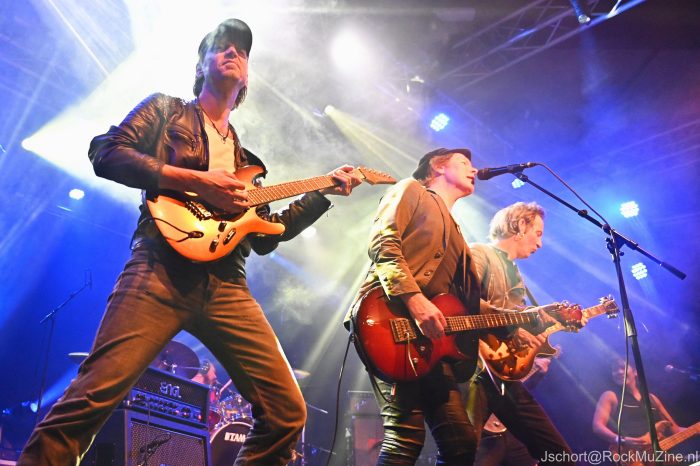 De misschien wel drie beste Nederlandse rockgitaristen — Menno Gootjes (Focus, Dio Memorial), Marcel Singor (Kayak, Ayreon, Plan Nine) en Mark Bogert (Magoria, Knight Area, Arena) — hebben de krachten gebundeld voor een korte tour om de fijnproevers van het betere zessnarengeweld te vermaken. Op een koude vrijdagavond vult de altijd gezellige Pul zich met zo’n 150 man en vrouw. Het muzikale geweld van vanavond is zó oorstrelend dat een grotere opkomst verdiend en logisch was geweest. Er passeren meer solo’s de revue dan er bezoekers zijn, maar dat zou zelfs met een volle Ziggo Dome het geval geweest zijn. Bij wijze van spreken dan. Want, sjesus, wat worden we verwend!